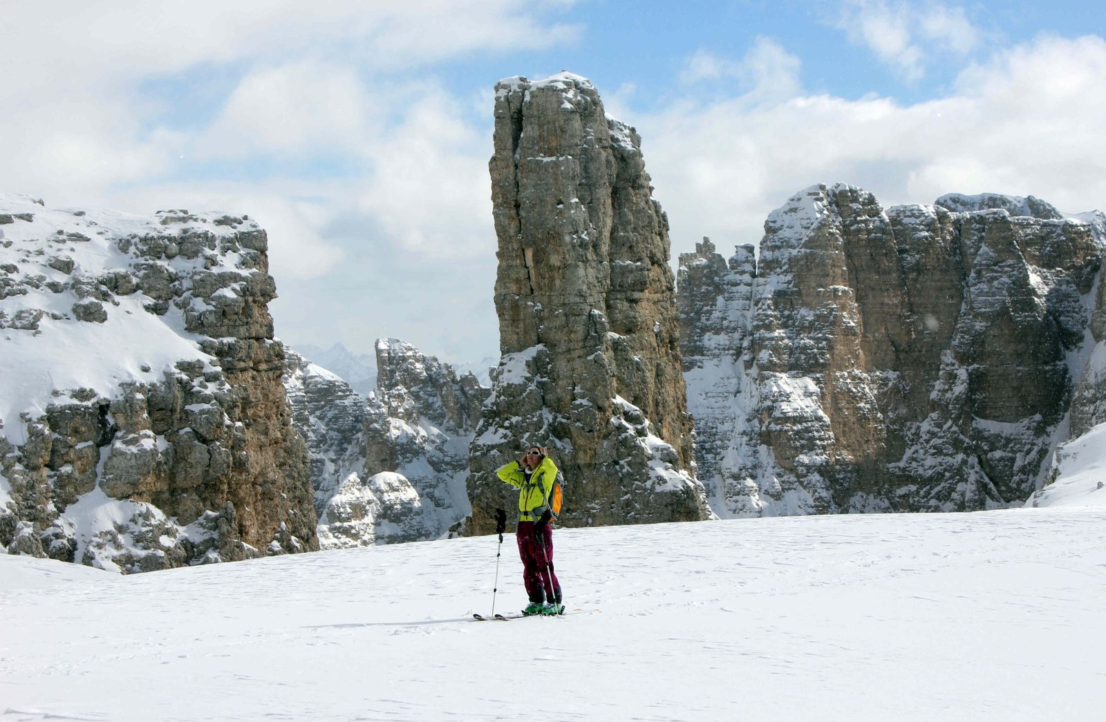 This morning we ski first to Piciodel lake(1820m) where we start our climbing toward Ciamin (2610m).A nice bowl allows a connection with the Ucia Fudara (1966m). The the last 100m up to 2080m before skiing along Val Selata until San Uberto(1449m). From this point a taxi will drive us to Cortina and pass Rolle